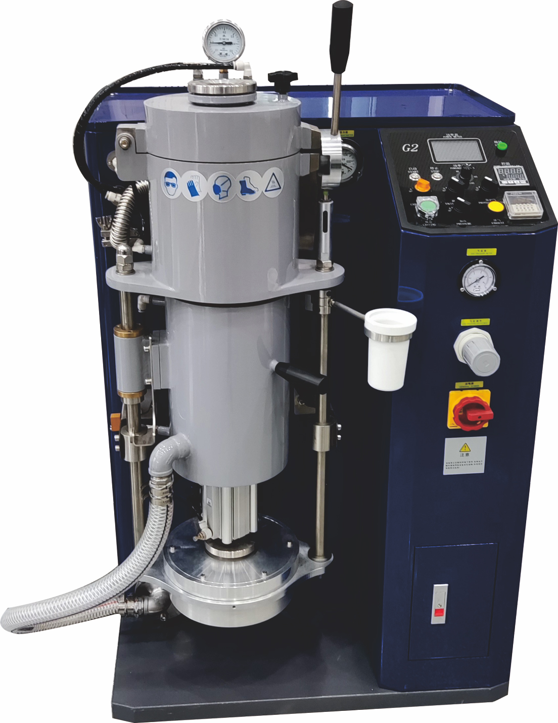 2.各部分功能介绍: 使用流程,打开水冷机、真空泵、空压机、开启氩气;顺时针开启真空铸造机电源;按压启动按键;调节功率旋钮调节至3-5;等待炉温升至680℃(600-700)℃;开启炉盖加料;盖盖同时加保护气;功率调至5-6;待炉温升至(800-900)℃,炉料熔化后开搅拌约3分钟;取出钢盅倒置放入铸造室,注意提前旋开白色陶瓷坩埚;转移铸造室至炉底垂直位置;提升打开;抽真空30″,压力表至-0.1(大件延长,小件4-5秒)铸造前关搅拌,铸造开同时开加压;等5-6秒关加压,关保护气、关抽真空;开排气;关提升;取钢盅。清理密封圈
